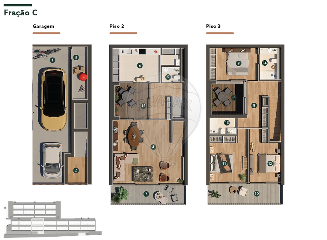 T3+1 duplex fracção C O empreendimento Douro39, é um condomínio fechado, com um novo conceito de habitação em que os apartamentos se encontram distribuídos em vários patamares, todos virados para o Rio Douro, com uma exposição solar de excelência (Nascente/Sul), que lhes proporciona uma luminosidade ímpar. É constituído por 13 habitações, de T2 a T3+1 duplex, com áreas brutas de construção muito generosas de 131m2 a 256m2, algumas com pátios interiores e todos com lugares de garagem e varandas panorâmicas. O empreendimento terá acabamentos de primeira qualidade, em que se destacam: - cozinhas da AMPLITUDE, completamente equipadas com electrodomésticos da BOSCH, tampos em SILESTONE e ferragens da BLUM; - caixilharia minimalista com corte térmico da SOSOARES sistema OS, acabamento lacado; - soalho em réguas de 2,40m em carvalho da CASTRO & FILHOS; - pavimentos da cozinha e casas de banho em MARGRES KERLITE; - louças de casa de banho e torneiras da PORCELANOSA; - ar condicionado DAIKIN, etc… O DOURO39 fica localizado entre a Ponte do Freixo e a Ponte D. Luís, numa zona que está a ser totalmente reabilitada, com a construção de novos acessos e de edifícios de boa qualidade. Fica a 700m da Marina do Freixo e VCI, a 500m da estação de Campanhã, a 1700m da Baixa do Porto e a 2200m da Ribeira, tendo por isso, uma facilidade enorme de deslocações para fora do Porto, como para o centro da cidade. A obra prevê-se que esteja finalizada em Junho e as escrituras deverão ser realizadas no terceiro trimestre deste ano. A REMAX está ao seu dispor para o/a ajudar a comprar o seu imóvel neste magnífico empreendimento DOURO39! Nota: as fotos apresentadas são imagens 3D e podem não refletir exactamente os materiais instalados nos apartamentos.