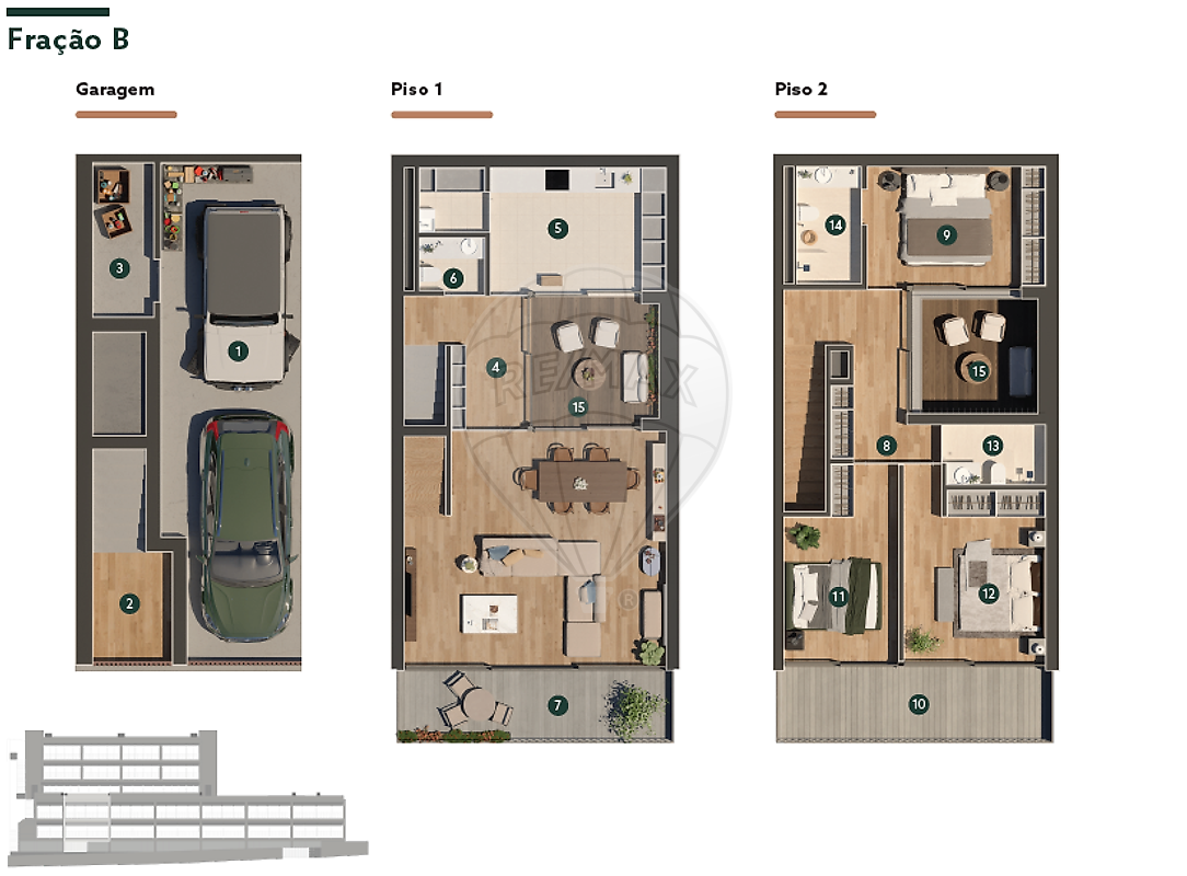 T3+1 duplex fracção B O empreendimento Douro39, é um condomínio fechado, com um novo conceito de habitação em que os apartamentos se encontram distribuídos em vários patamares, todos virados para o Rio Douro, com uma exposição solar de excelência (Nascente/Sul), que lhes proporciona uma luminosidade ímpar. É constituído por 13 habitações, de T2 a T3+1 duplex, com áreas brutas de construção muito generosas de 131m2 a 256m2, algumas com pátios interiores e todos com lugares de garagem e varandas panorâmicas. O empreendimento terá acabamentos de primeira qualidade, em que se destacam: - cozinhas da AMPLITUDE, completamente equipadas com electrodomésticos da BOSCH, tampos em SILESTONE e ferragens da BLUM; - caixilharia minimalista com corte térmico da SOSOARES sistema OS, acabamento lacado; - soalho em réguas de 2,40m em carvalho da CASTRO & FILHOS; - pavimentos da cozinha e casas de banho em MARGRES KERLITE; - louças de casa de banho e torneiras da PORCELANOSA; - ar condicionado DAIKIN, etc… O DOURO39 fica localizado entre a Ponte do Freixo e a Ponte D. Luís, numa zona que está a ser totalmente reabilitada, com a construção de novos acessos e de edifícios de boa qualidade. Fica a 700m da Marina do Freixo e VCI, a 500m da estação de Campanhã, a 1700m da Baixa do Porto e a 2200m da Ribeira, tendo por isso, uma facilidade enorme de deslocações para fora do Porto, como para o centro da cidade. A obra prevê-se que esteja finalizada em Junho e as escrituras deverão ser realizadas no terceiro trimestre deste ano. A REMAX está ao seu dispor para o/a ajudar a comprar o seu imóvel neste magnífico empreendimento DOURO39! Nota: as fotos apresentadas são imagens 3D e podem não refletir exactamente os materiais instalados nos apartamentos.