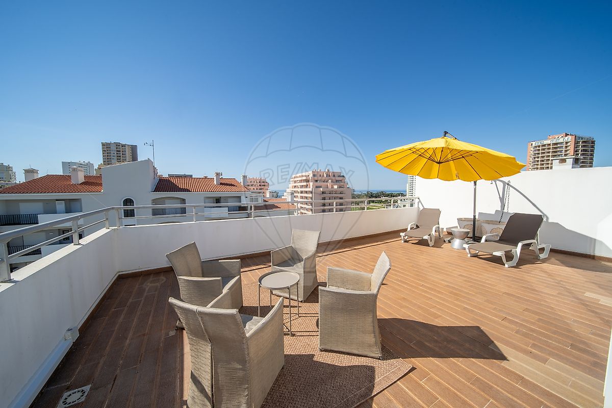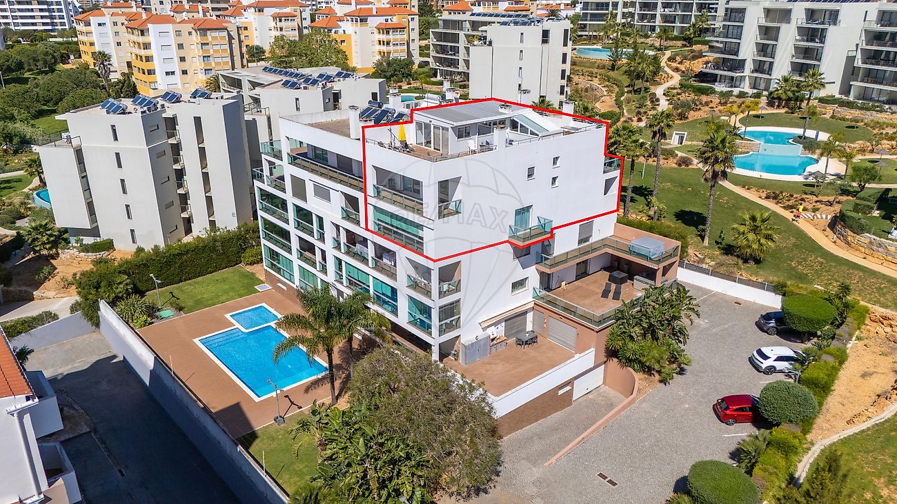 Exclusive T5 Duplex Penthouse with Private Rooftop, Jacuzzi & Sea View — Quiet Prime Area of Praia da Rocha Set within an exclusive high-end condominium of only 9 apartments, this exceptional T5 duplex penthouse offers a rare combination of space, privacy and refined living, positioned in one of the most quiet and sought-after areas of Praia da Rocha, just a 7-minute walk from the beach. Occupying the top floors of the building, this property stands out for its generous layout, premium finishes and a unique private rooftop designed for true indoor-outdoor living. First Floor A spacious entrance hall leads into a semi open-plan living and dining area, seamlessly connected to a fully equipped kitchen. Natural light flows throughout, extending onto a south-facing balcony with a built-in BBQ area and enclosed storage, ideal for entertaining and enjoying the Algarve lifestyle. This level also includes one suite bedroom with built-in wardrobes, a guest WC and additional storage. Second Floor The upper level is dedicated to privacy, offering four suite bedrooms, all with built-in wardrobes and most with private balconies. A large additional storage area and hallway closet enhance functionality, making the property ideal for both family living and extended stays. Rooftop Terrace The private rooftop terrace is the defining feature of this property. Designed for both relaxation and entertaining, it includes a south-facing lounge area with open views and partial sea view, a fully enclosed support area with additional storage, an open-plan kitchen with indoor lounge and TV area, an interior jacuzzi for year-round use, and a north-facing shaded dining area with a secondary lounge space. Quality & Comfort The property benefits from high-end materials and premium finishes throughout, full air conditioning, underfloor heating in all bathrooms, and strong construction quality within a well-maintained condominium. Condominium Features Exclusive building with only 9 apartments, top-floor positioning ensuring maximum privacy, shared swimming pool with landscaped green areas, private boxed garage for 2 cars plus storage, and additional parking within the closed condominium.