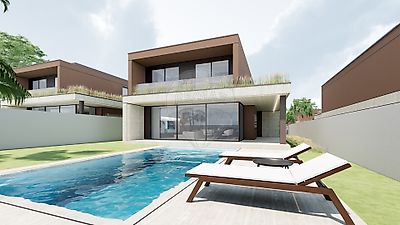 Cada moradia é desenvolvida em dois pisos acima da cota de soleira — piso 0 e piso 1 — com a possibilidade de piscina, já contemplada no projeto de loteamento.