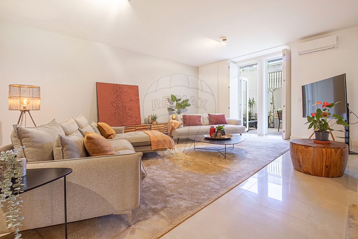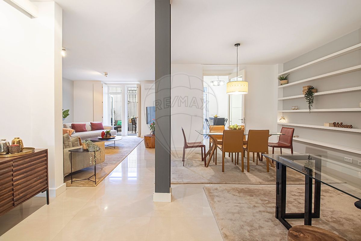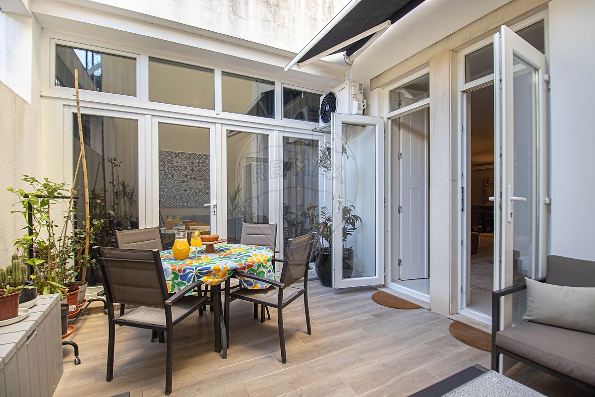 Com cerca de 143m² de área bruta (incluindo o pátio), oferece: Sala ampla com 58m², cheia de luz natural, ideal para receber família e amigos Cozinha totalmente equipada Dois quartos principais (um em suíte), com soalho em madeira, portadas originais e aquecimento Um terceiro quarto com acesso direto ao pátio — perfeito como escritório, quarto de hóspedes ou espaço criativo Ar condicionado na sala e pé direito alto que reforça a sensação de elegância e amplitude Viver aqui é ter o melhor de dois mundos: a centralidade cosmopolita, rodeada de comércio, restaurantes, escolas e transportes, com o privilégio raro de um espaço exterior totalmente privado.