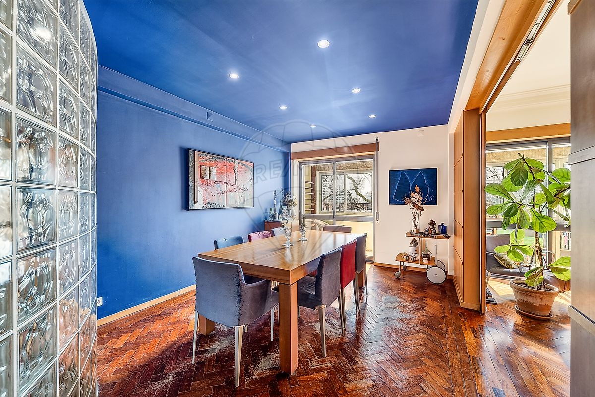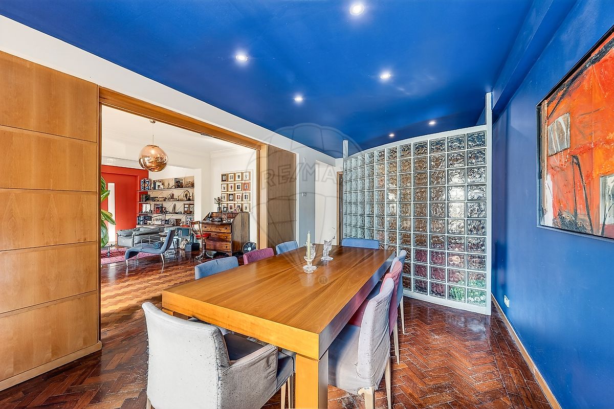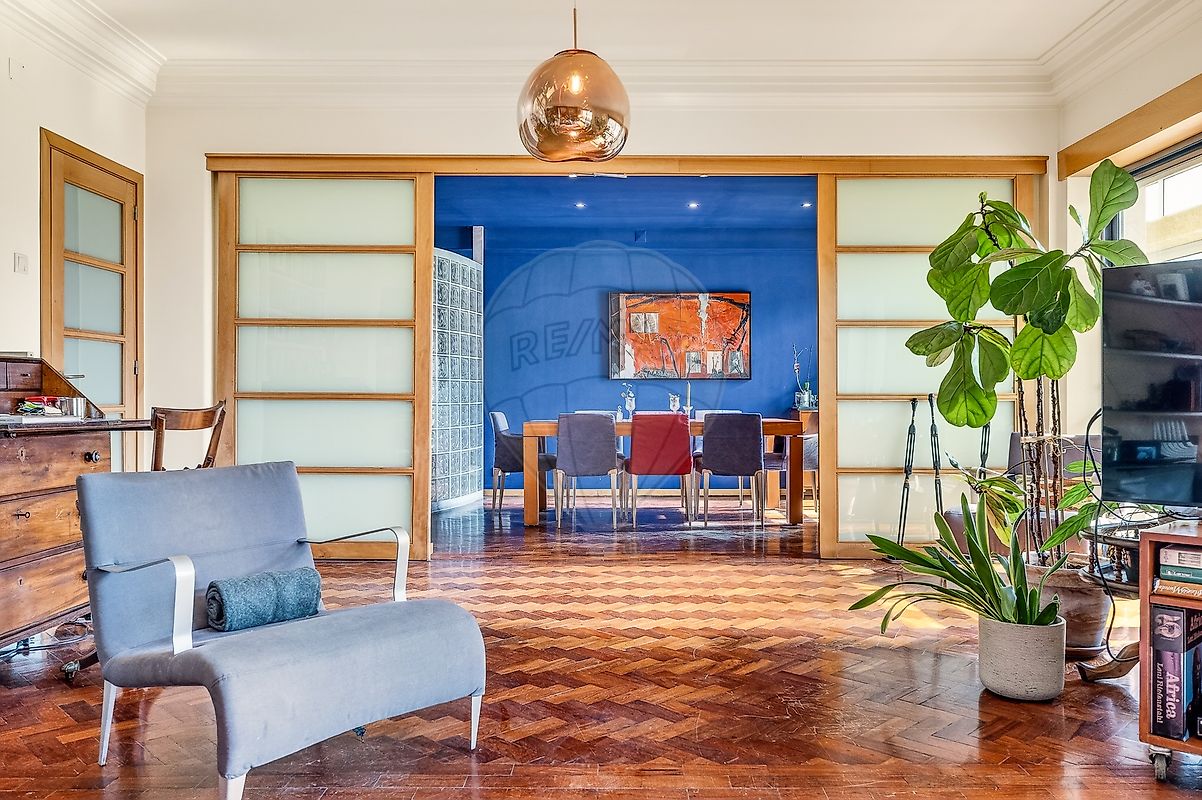 Zona social ampla e luminosa A área social é um dos grandes destaques da casa. A sala de estar (34 m²) e a sala de jantar (15 m²) formam um espaço amplo com quase 50 m² , ideal para criar uma elegante zona de convívio em open-space. Toda esta área é servida por uma varanda ao longo de toda a sua extensão , com orientação a sul , garantindo excelente exposição solar e uma luminosidade natural muito agradável ao longo do dia. O pavimento é em soalho de madeira maciça , típico dos apartamentos clássicos lisboetas, conferindo carácter, elegância e autenticidade ao espaço. Potencial de transformação A configuração atual permite várias possibilidades de reorganização arquitetónica, nomeadamente: Ampliação dos quartos existentes Criação de suites com closet integrado Reorganização da zona privada para maior conforto Integração de espaços contemporâneos mantendo o charme original do imóvel Esta versatilidade torna o apartamento particularmente interessante para quem procura personalizar um imóvel de grande dimensão numa localização prime de Lisboa .