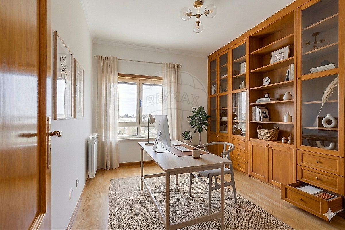 Marque já a sua visita! ABP: 153 + 31 m2 ABD: 4 m2 ----------------------------------------------------- Spacious 4-Bedroom Apartment in Alverca – Comfort, Space and Open Views We present this magnificent 4-bedroom apartment with 153 m² of gross private area, located in the center of Alverca. A rare opportunity for those seeking a home that combines generous spaces, excellent condition, and a strategic location. Property Highlights: Social Area & Entrance Hall: Upon entering, you are welcomed by an impressive entrance hall featuring a wooden ceiling and built-in lighting, creating a warm and distinctive atmosphere. The apartment also includes a pantry/closet near the entrance, as well as a guest bathroom. Fully Equipped Kitchen: A large kitchen with ample storage, fully equipped and ready to meet the needs of a large family.